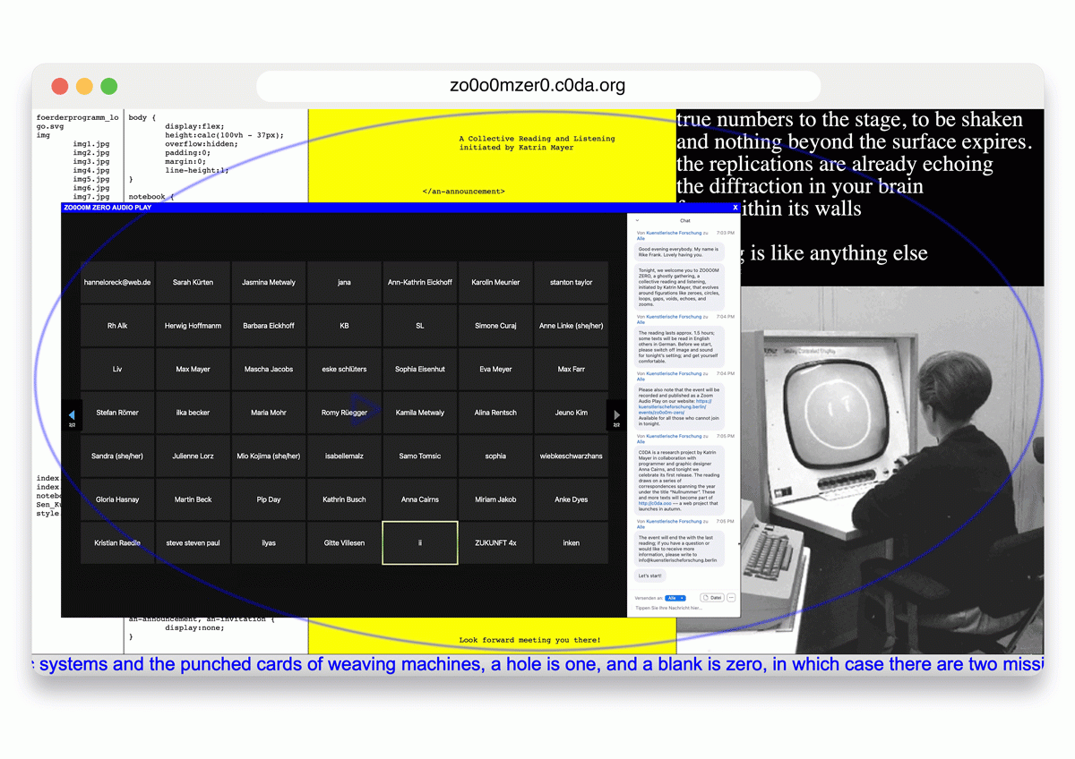 we would like to invite you to a ghostly gathering, a collective reading and listening on Zoom. The reading is an experiment that evolves around figurations like zeroes, circles, loops, gaps, voids, echos and zooms.