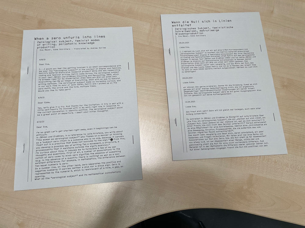 As a connective motif, Katrin Mayer proposes the figure of the zero. It belongs to computer code but also to the “zerological subject”, a term by Julia Kristeva that was later revived and underlined by Eva Meyer. Here, identity, self and writing are seen as movements and practices eager to elude a binary logic and to not subordinate themselves to the sign.