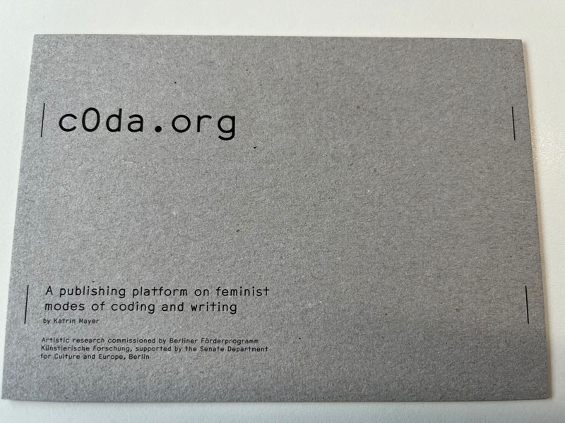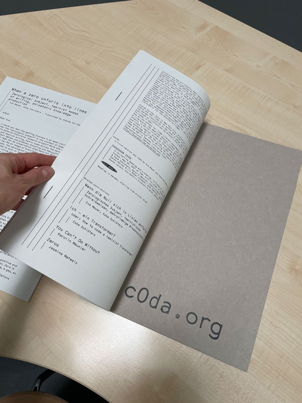 c0da is a research project and publishing platform conceived by artist Katrin Mayer that deals with feminist modes of coding and writing. Developed during a grant of the Berlin Artistic Research Programme* (2020 / 2021) and in close collaboration with graphic designer and programmer Anna Cairns, it interweaves the herstory of the internet with herstories of writing.