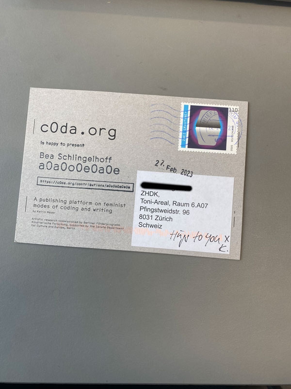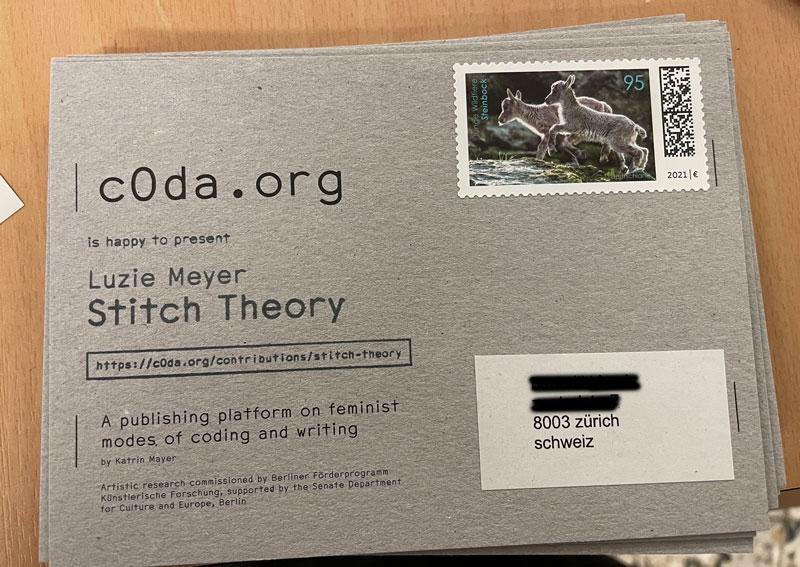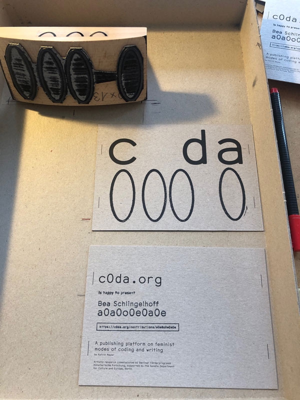 c0da is a research project and publishing platform conceived by artist Katrin Mayer that deals with feminist modes of coding and writing. Developed during a grant of the Berlin Artistic Research Programme* (2020 / 2021) and in close collaboration with graphic designer and programmer Anna Cairns, it interweaves the herstory of the internet with herstories of writing.